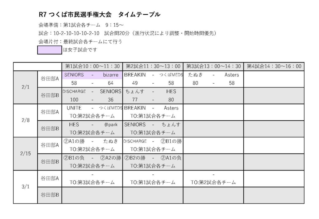 R7年度つくば市民選手権大会2/1結果 投稿者: つくば市バスケットボール協会 事務局 | 2026年2月1日 0件のコメント 2/1結果を反映したタイムテーブルと男子トーナメント表を更新しました。 女子は本日大会が終了し、順位が決定しました。優勝:bizarre 準優勝:SENIORS
