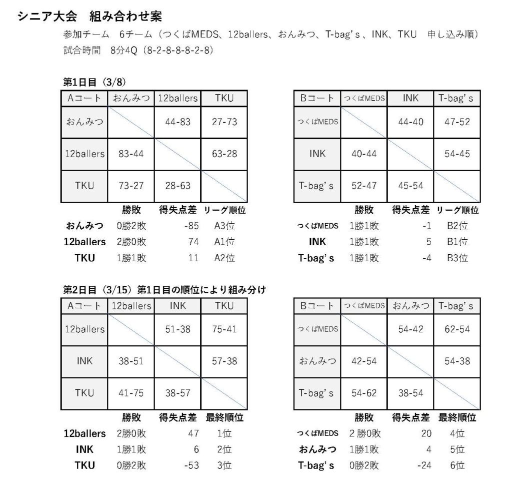 R7年度つくば市シニア大会最終結果 投稿者: つくば市バスケットボール協会 事務局 | 2026年3月15日 0件のコメント 本日全日程を終了し、最終順位が決定いたしました。 ご協力ありがとうございました。